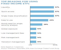 In fixed income, institutions around the world have started using ETFs to enhance portfolio liquidity amid declines in overall market liquidity. Institutions’ need for liquidity to support their sizable fixed-income portfolios could speed up the adoption of bond ETFs in Asia.