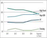 Larger institutions in Japan now execute only roughly 41% of trades as traditional single stock high-touch trades, well down from 48% in 2011. This reflects low touch single stock trades rising from 33% of trading volume to 36% and an expected 40%...