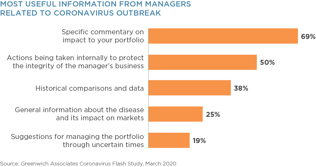 Fourth, investors are seeking general information about the coronavirus and its impact on markets. Investment committees and boards are absorbing as much information as possible to assess whether pre-existing investment guidelines and principles remain reasonable and whether any short-term shifts are required. Managers that can utilize their macro research capabilities to provide data and commentary can help position themselves as strategic partners to these now vulnerable key decision makers.