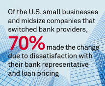 Despite recent turmoil among regional banks, companies planning deposit moves are not necessarily fleeing regional providers. About 30% of companies planning to move balances expect to place them at a national bank. Of the U.S. small businesses and midsize companies that switched bank providers, 70% made the change due to dissatisfaction with their bank representative and loan pricing.
