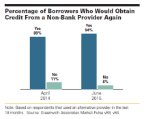 About 8 in 10 of these companies say the process of obtaining credit is easier with non-banks than with traditional banks. A full 51% contend it is “much easier” to get credit from non-bank lenders. Of even more concern to traditional banks is the fact that roughly 94% of non-bank borrowers say they would obtain credit from a non-bank provider again. That share is up from the approximately 89% of non-bank borrowers who said they would return to non-banks for credit last year.