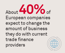 As large European corporates work through supply chain issues and manage expanding international trade volumes, many are shifting trade finance business among providers. About 40% of European companies say they expect to increase or decrease the amount of business they do with current trade finance providers in the year ahead. Companies in the United Kingdom and Ireland are among the most likely to shift business, a finding that makes sense given the highly competitive trade finance market in those countries and the large number of domestic and international banks competing for their business.