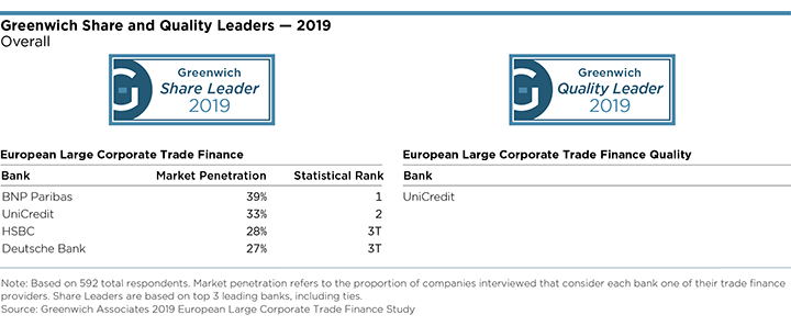 The localized nature of the business also comes through in quality evaluations. Across Europe, UniCredit has secured the tile of 2019 Greenwich Quality Leader℠ in European Trade Finance. And at the country level, domestic banks usually take top honors, such as BNP Paribas in France, SEB in the Nordics, and Credit Suisse and UBS in Switzerland.