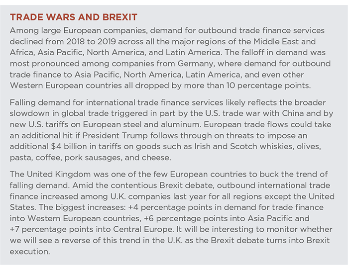 On the surface, companies’ emphasis on international networks would seem to be a major advantage for the biggest global banks. However, while globalized U.S. banks have made major inroads in the European market in corporate banking and cash management, the 2019 list of Greenwich Share Leaders℠ in European Large Corporate Trade Finance remains a strictly European affair, with BNP Paribas in the top spot, followed by UniCredit and then a tie between HSBC and Deutsche Bank. At the country/regional level, local and domestic providers dominate the lists of 2019 Share Leaders, with Commerzbank sharing the top spot with UniCredit in Germany, BBVA leading the field in Iberia, Intesa Sanpaolo securing top honors in Italy, and Nordea claiming the first place ranking in the Nordics.
