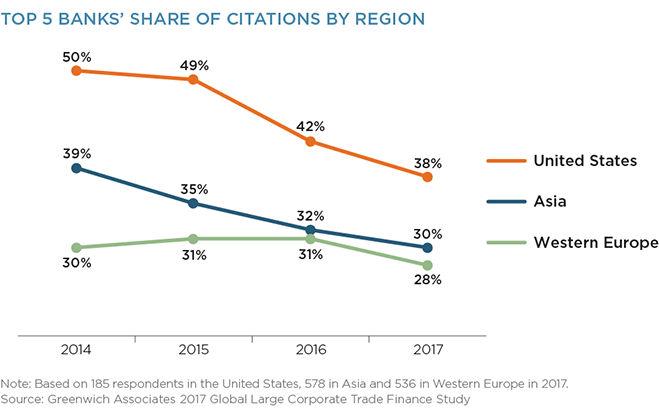 The biggest driver of change in trade finance currently is the shift in strategy on the part of the world’s largest banks. Although the list of 2017 Greenwich Leaders in Large Corporate Trade Finance is still composed of global banks—like BNP Paribas in Europe, Bank of America Merrill Lynch and J.P. Morgan in the United States, and HSBC in Asia—their share of relationships (market penetration) have collectively decreased over the past six years.
