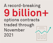 U.S. option market volumes caught fire in 2021. Records were made, broken and then almost immediately broken again. The top six volume months in the history of the Options Clearing Corporation (OCC) reporting occurred in 2021. By the end of November 2021, volumes had already exceeded 2020’s record-breaking 7.52 billion contracts traded, with over 9 billion contracts traded. Moreover, the notional value of options traded in the United States has grown to top that of equities throughout the year.