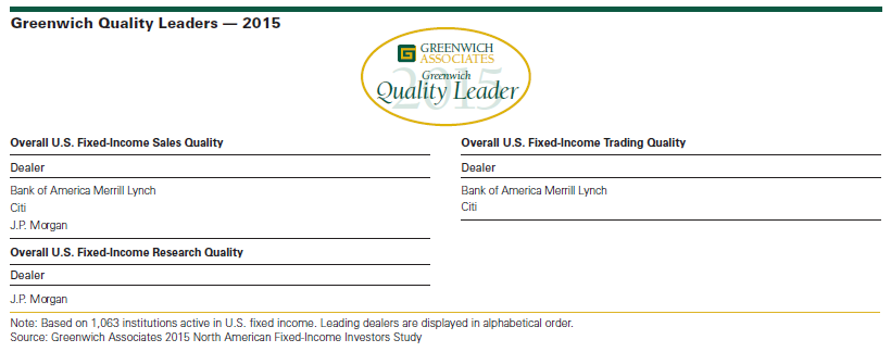 The 2015 Greenwich Quality Leaders in U.S. Fixed-Income Sales are Bank of America Merrill Lynch, Citi and J.P. Morgan, and and this year’s Greenwich Quality Leader in U.S. Fixed-Income Research is J.P. Morgan. In U.S. Fixed-Income Trading, the 2015 Greenwich Quality Leaders are Bank of America Merrill Lynch and Citi.