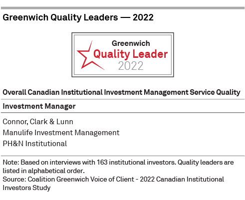 The following table presents the 2022 Greenwich Quality Leaders in Institutional Investment Management Service in Canada. These asset managers have distinguished themselves from competitors by delivering superior levels of client service that help institutional investors achieve their investment goals and objectives.