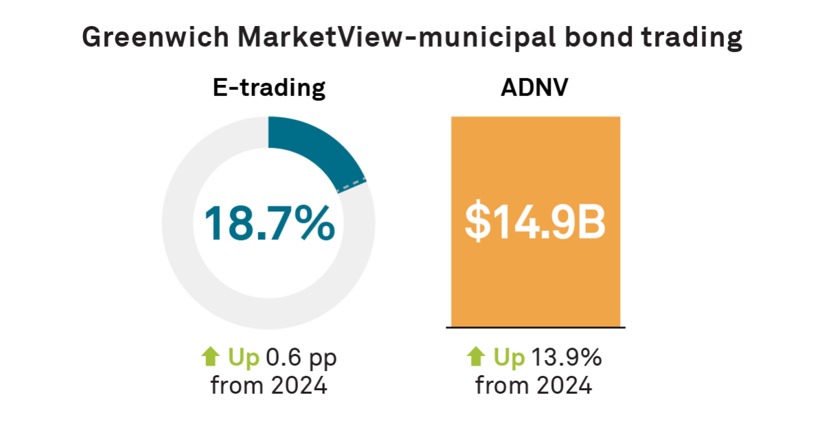Trading in municipal bonds grew in 2025 for the first time in three years, up nearly 12% year over year with the average daily notional volume (ADNV) traded reaching nearly $15 billion per day—a record. The secondary market activity was helped by record new issuance, which was up 4.5% year over year catalyzed by lower rates, strong infrastructure spending and investor demand for the bonds.