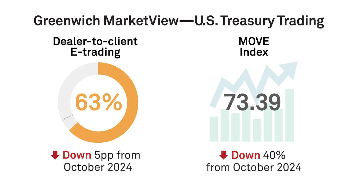 U.S. Treasury average daily notional volume (ADNV) traded in October came in just shy of $1 trillion, marking an 11% increase from October 2024. Treasury Bill trading between dealers and clients accounted for roughly one quarter of the year-over-year volume increase, reflecting continued strong demand for short-dated paper.